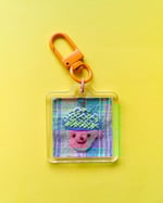This is a one-of-a-kind felt collage keychain designed, embroidered, and assembled by me as part of my Peachtober 2025 challenge!